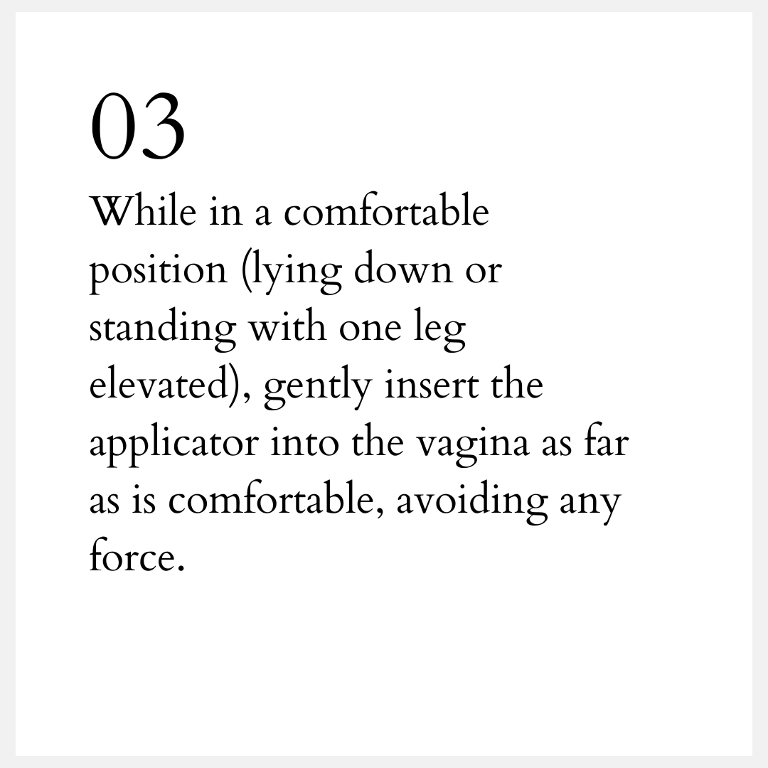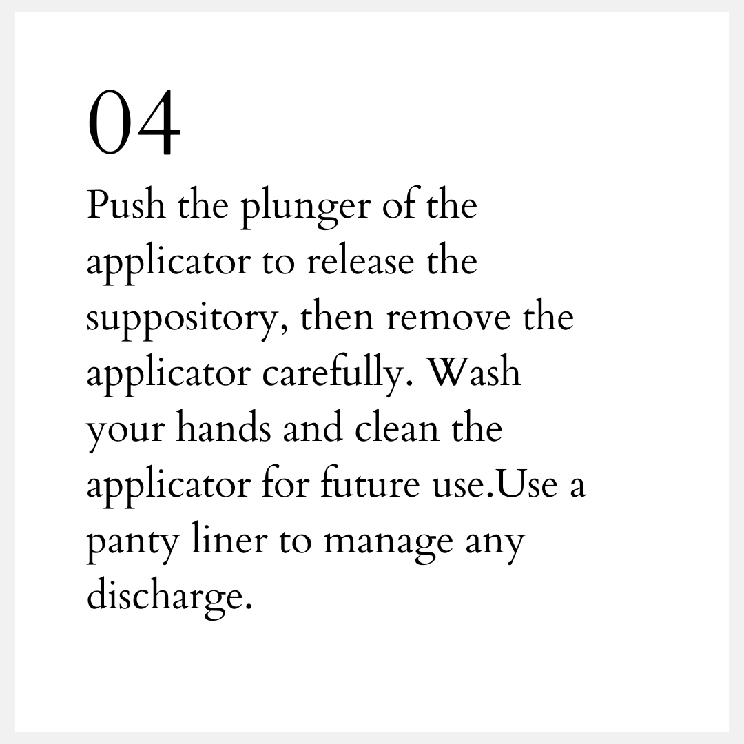 The applicator ensures easy and hygienic insertion. Always wash your hands and the applicator before and after use. For best results, insert the capsule as deeply into the vagina as comfortably possible and allow it to dissolve overnight.