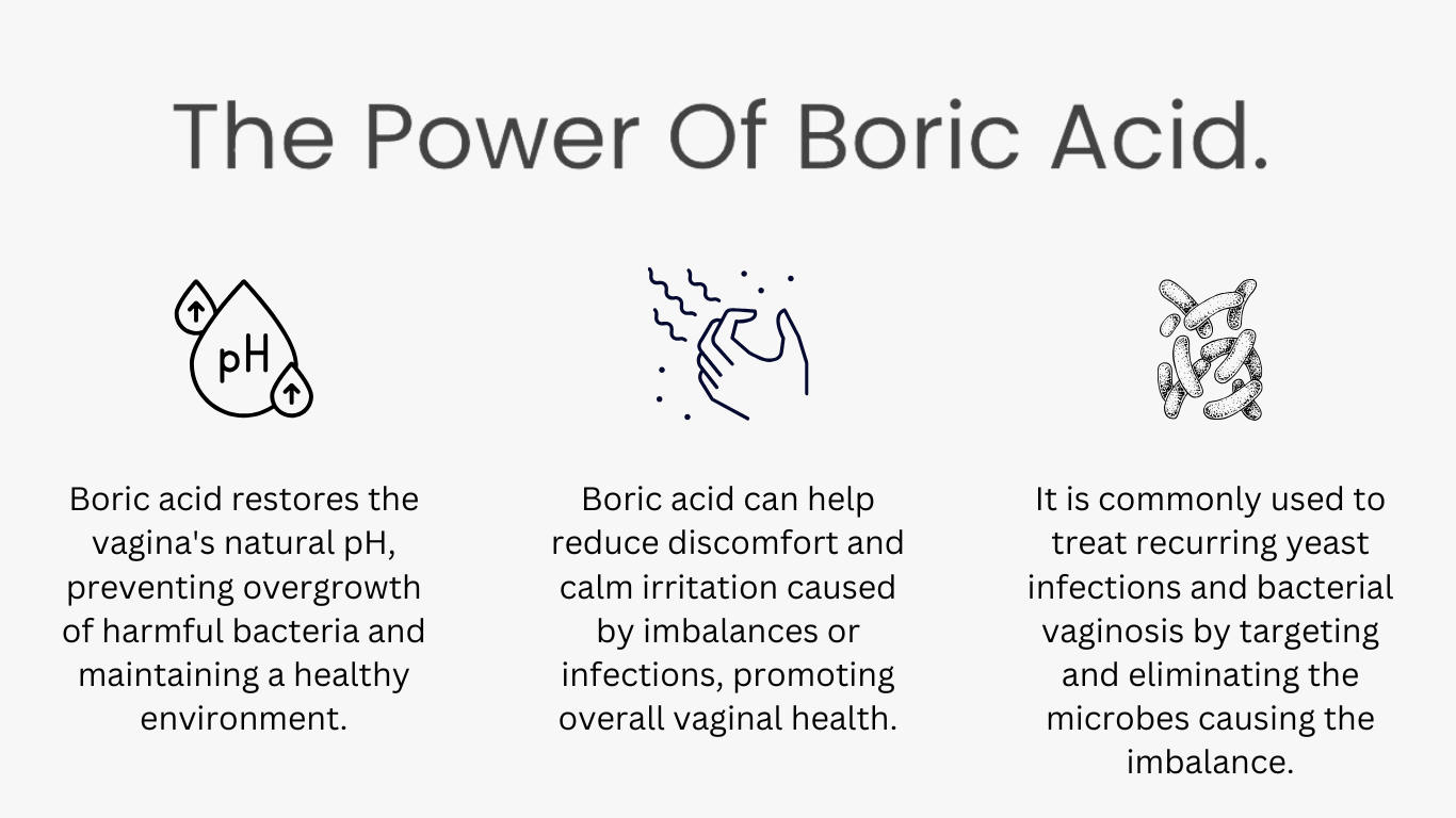 - Active Ingredient: Boric Acid (600mg per suppository)