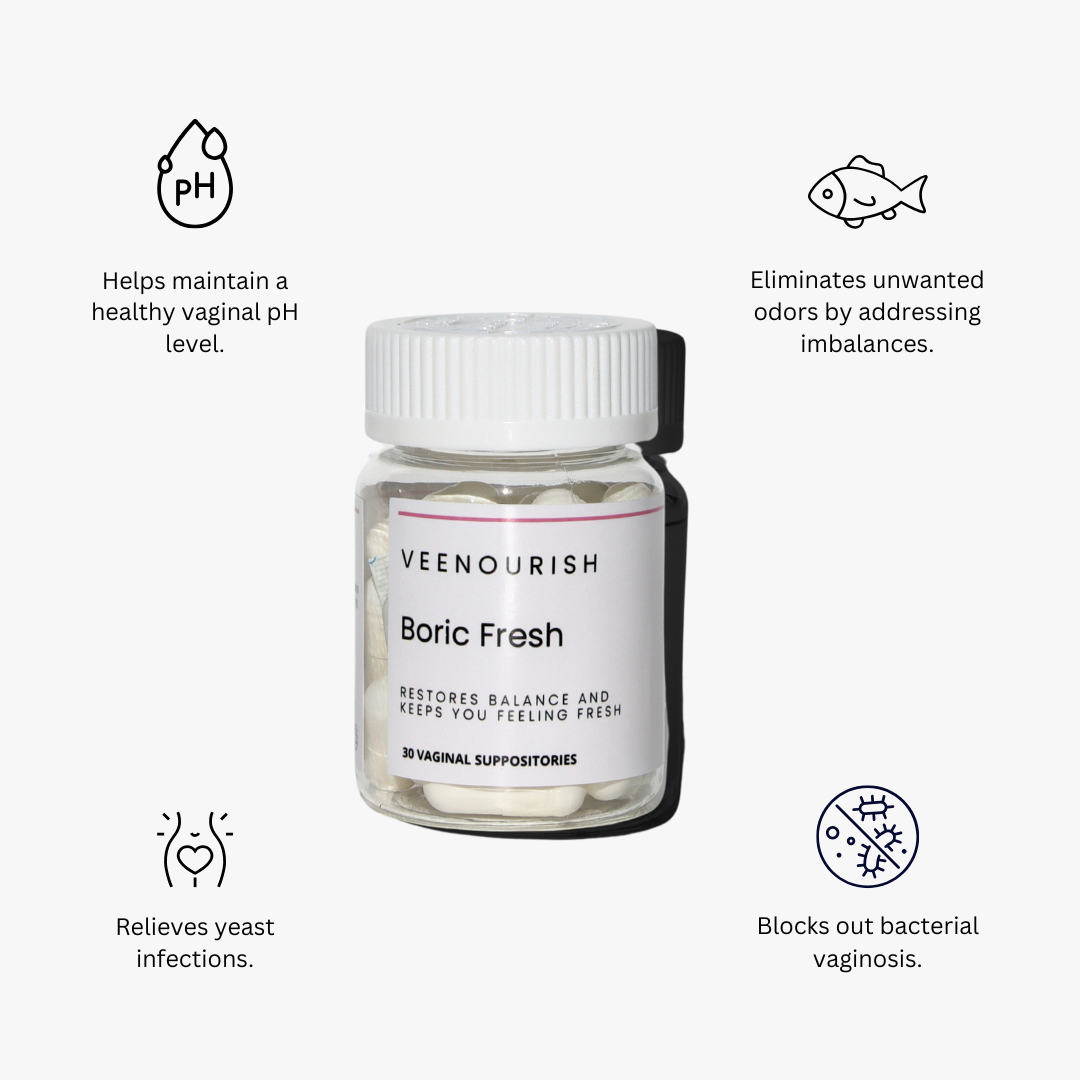 Meet our Boric Fresh Vaginal Suppositories, they are here to support your intimate health when things feel out of balance. Made with pure boric acid, they help restore your vaginal pH, providing relief from yeast infections, bacterial vaginosis (BV), and unwanted odors. These gentle yet effective suppositories work to soothe irritation and discomfort while promoting a fresher, healthier feeling. Use them as directed for a simple, natural solution to keep everything balanced—because you deserve to feel confident and comfortable every day. 💗