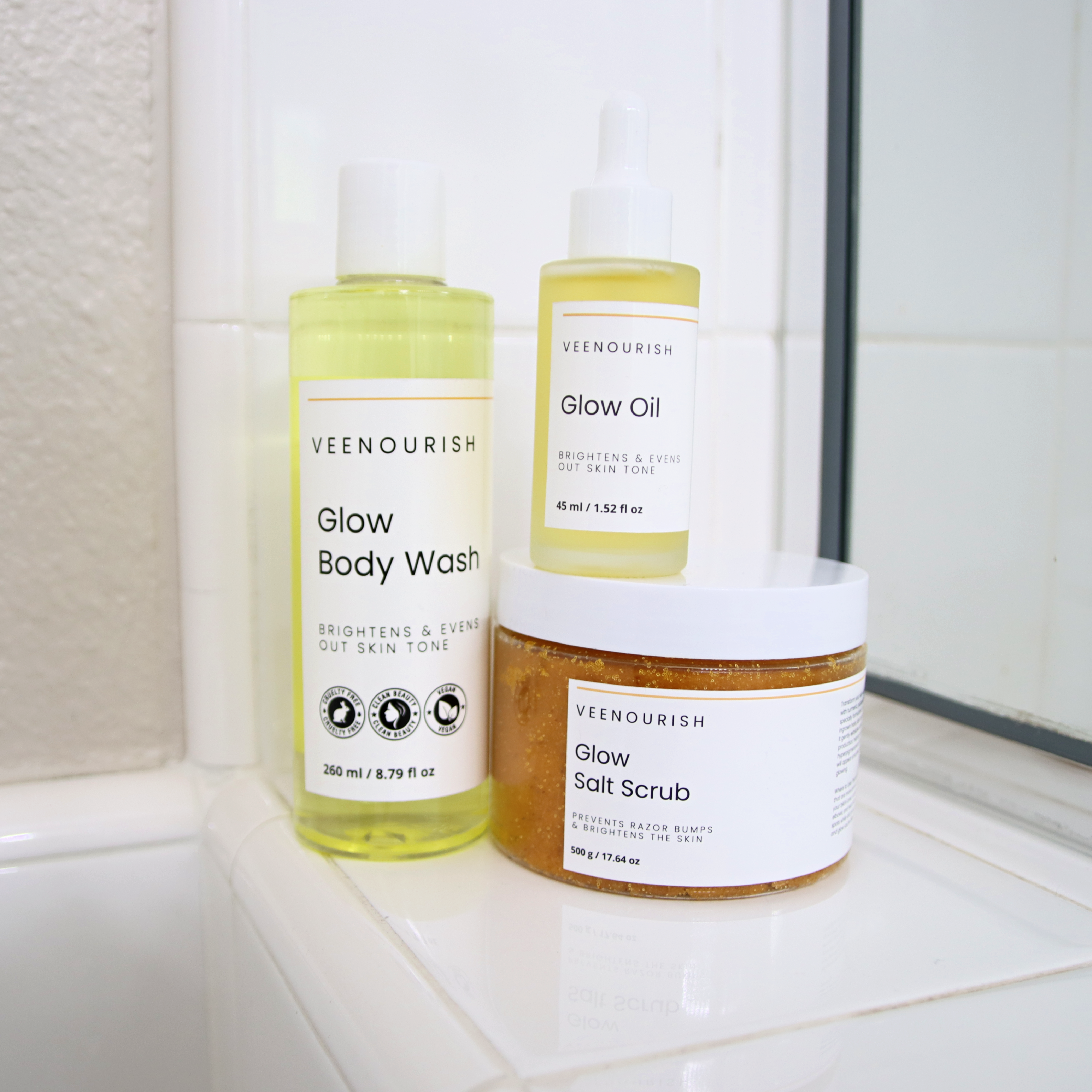 When using the Glow Body Wash, it’s important to know that consistency is key to seeing noticeable improvements in dark spots and achieving a more even skin tone. For the best results, pair it with the other products in our Glow Collection, specifically formulated to target discoloration and uneven skin tone. Together, these products work synergistically to amplify your results and leave your skin looking even, smooth, clear, and glowing.