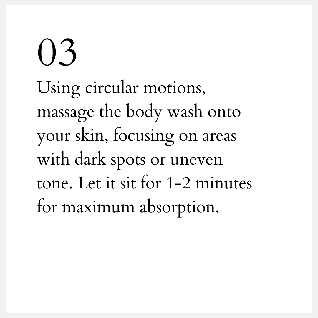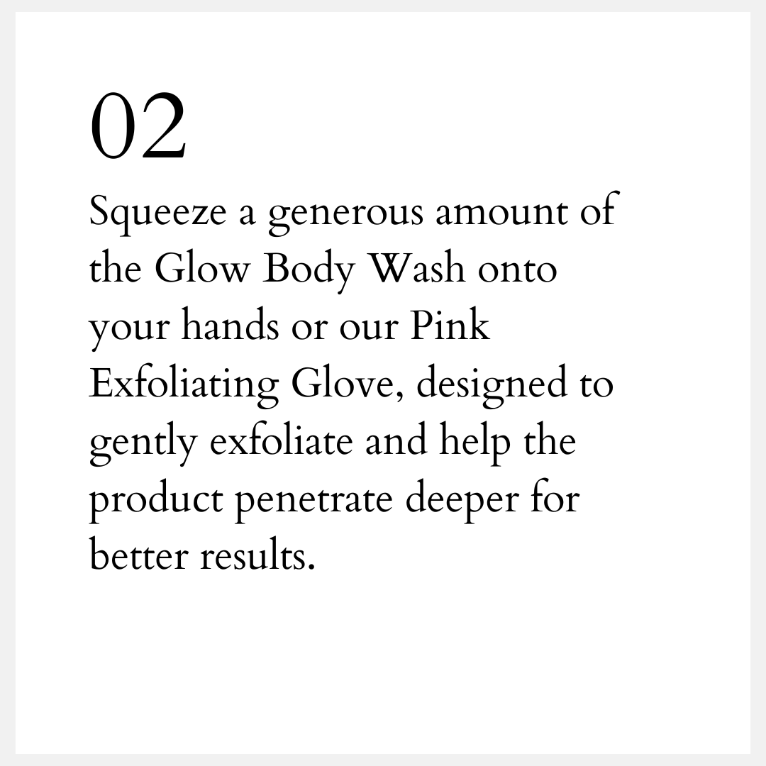 Apply the Glow Body Wash to wet skin and lather using your hands or our Pink Exfoliating Gloves. Focus on areas with dark spots or uneven tone, then rinse thoroughly. Use daily for best results and follow with other products from the Glow Collection.