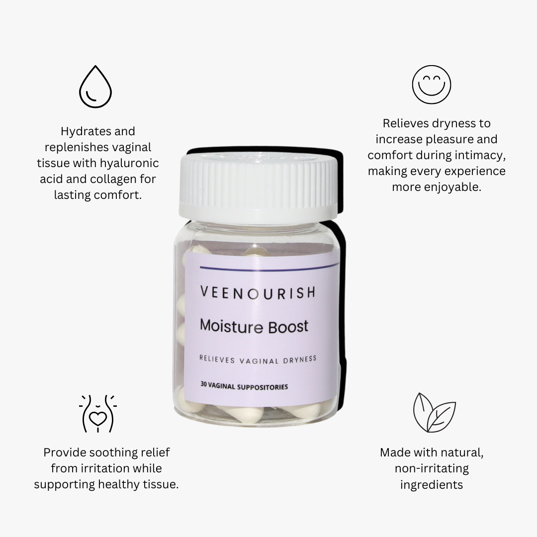 Our Moisture Boost Vaginal Suppositories are designed to gently restore your natural moisture and provide soothing relief from vaginal dryness. Formulated with nourishing ingredients like hyaluronic acid and collagen, these suppositories replenish hydration and rejuvenate vaginal tissue for lasting comfort. Perfect for sensitive skin, hormone-free, and made with natural ingredients, these suppositories are here to help you feel confident, comfortable, and cared for.