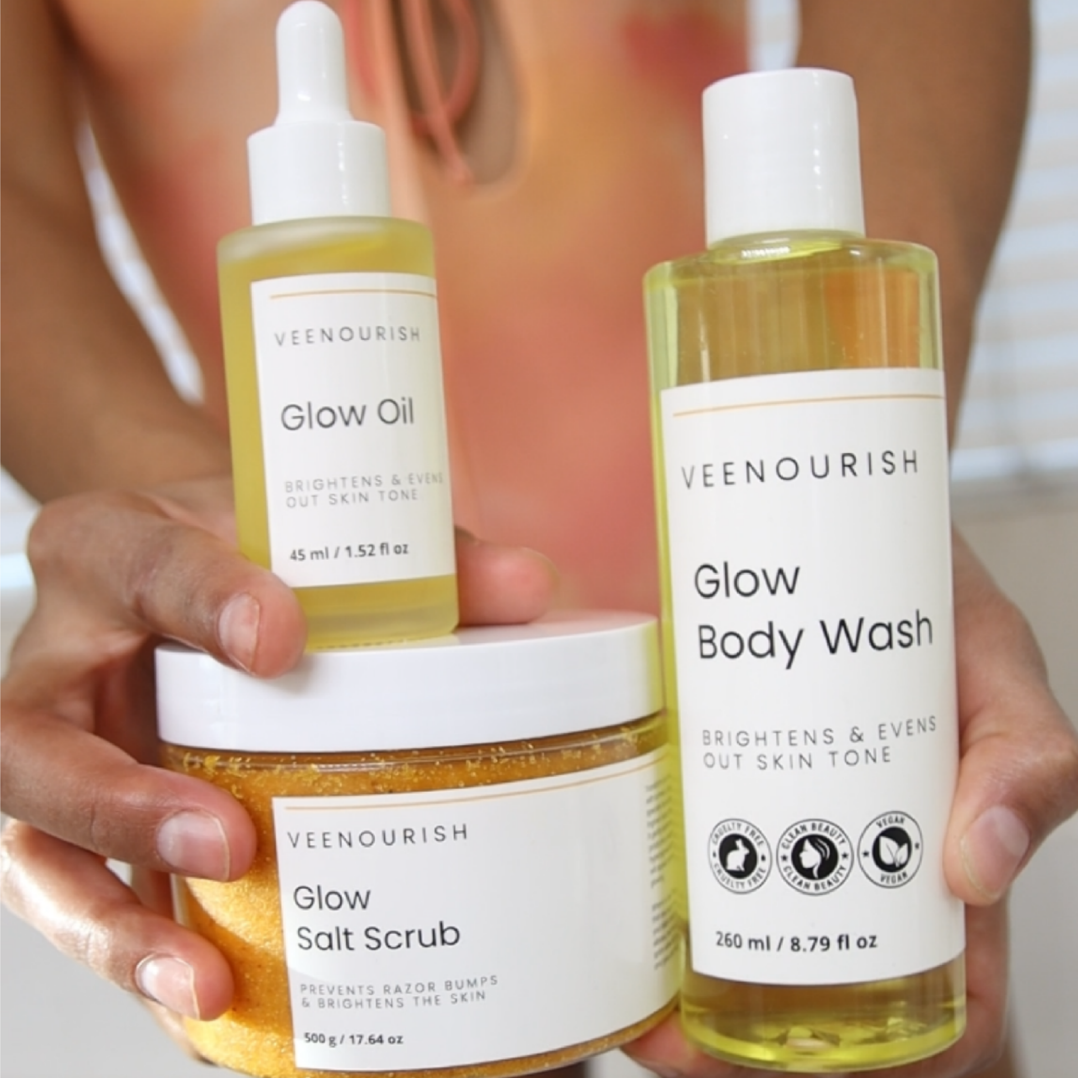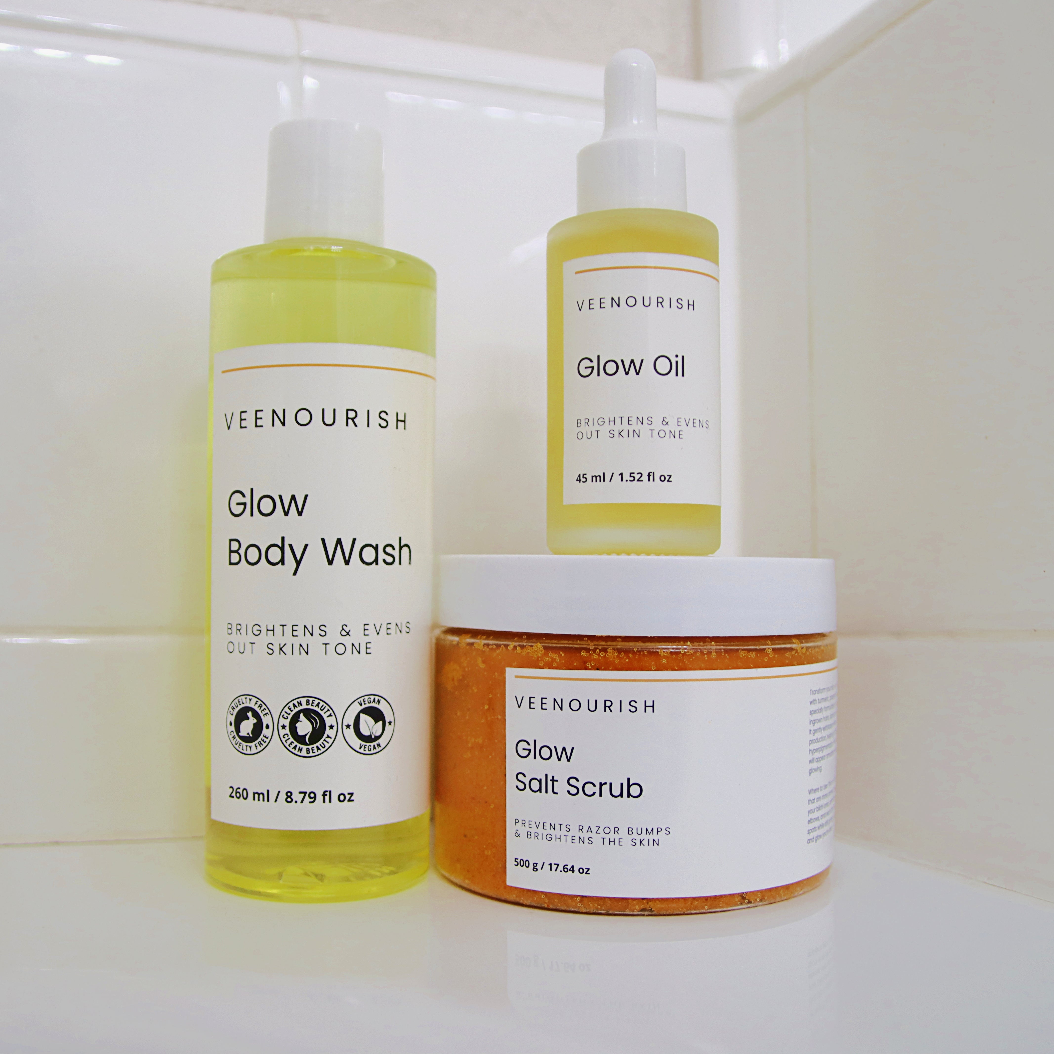 For best results, consistency is key! Using the Glow Body Wash, Glow Salt Scrub, and Glow Oil together ensures each product complements the other, giving you maximum benefits like fading dark spots, preventing ingrown hairs, and evening out skin tone. To protect your skin and maintain results, always apply sunscreen after using these products, especially during the day, as exfoliating can make your skin more sensitive to the sun. Stick with this routine, and you’ll see smoother, healthier, and glowing skin over time!